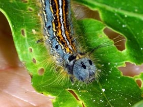 Der Ringelspinner - Malacosoma neustria - erreicht eine Flügelspannweite von 25 bis 42 mm. Die Flugzeit geht von Juni bis August. Dieser Nachtfalter ist nördlich der Alpen nicht sehr häufig, neigt aber in manchen Jahren zu einer Massenvermehrung. Futterpflanze der Raupen sind Obstbäume bis zu Saalweiden und verschiedene Kräuter. Die Eier werden ringförmig um Zweige gelegt.