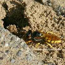 Der Bienenwolf fängt ausschließlich Honigbienen. Diese greift er blitzschnell beim Blütenbesuch an und lähmt sie mit einem Stich. Danach presst er den Leib der Biene zusammen um einen aus dem Rüssel austretenden Nektartropfen aufzusaugen. Die gelähmte Biene wird zu seinem Nest transportiert. Dieses Nest wird überwiegend in Steilhängen angelegt, wie das Foto zeigt auch in ebener Erde. Der Nestgang kann bis zu 1 m tief in die Erde führen, am Ende verzweigt der Gang zu den einzelnen Brutzellen. Je nach Geschlecht der Nachkommenschaft werden für männliche Nachkommen 1- 3 und für weibliche Nachkommen 3 - 6 Bienen je Brutzelle und gelegtes Ei gefangen. Der abgebildete Bienenwolf hatte sein Nest in den Plattenritzen eines Fußweges gegraben.
