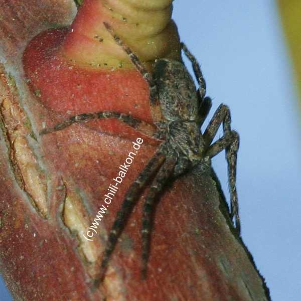 Dieser Flachstrecker wird ca. 5 - 6 mm lang. Als zur Familie der Laufspinnen gehörig fängt sie ihre Beute frei umherjagend. Das Weibchen des Philodromus aureolus bewacht nach der Eiablage seinen flachen Kokon. Ab Anfang April kann man diese Spinne häufig im Garten beobachten.